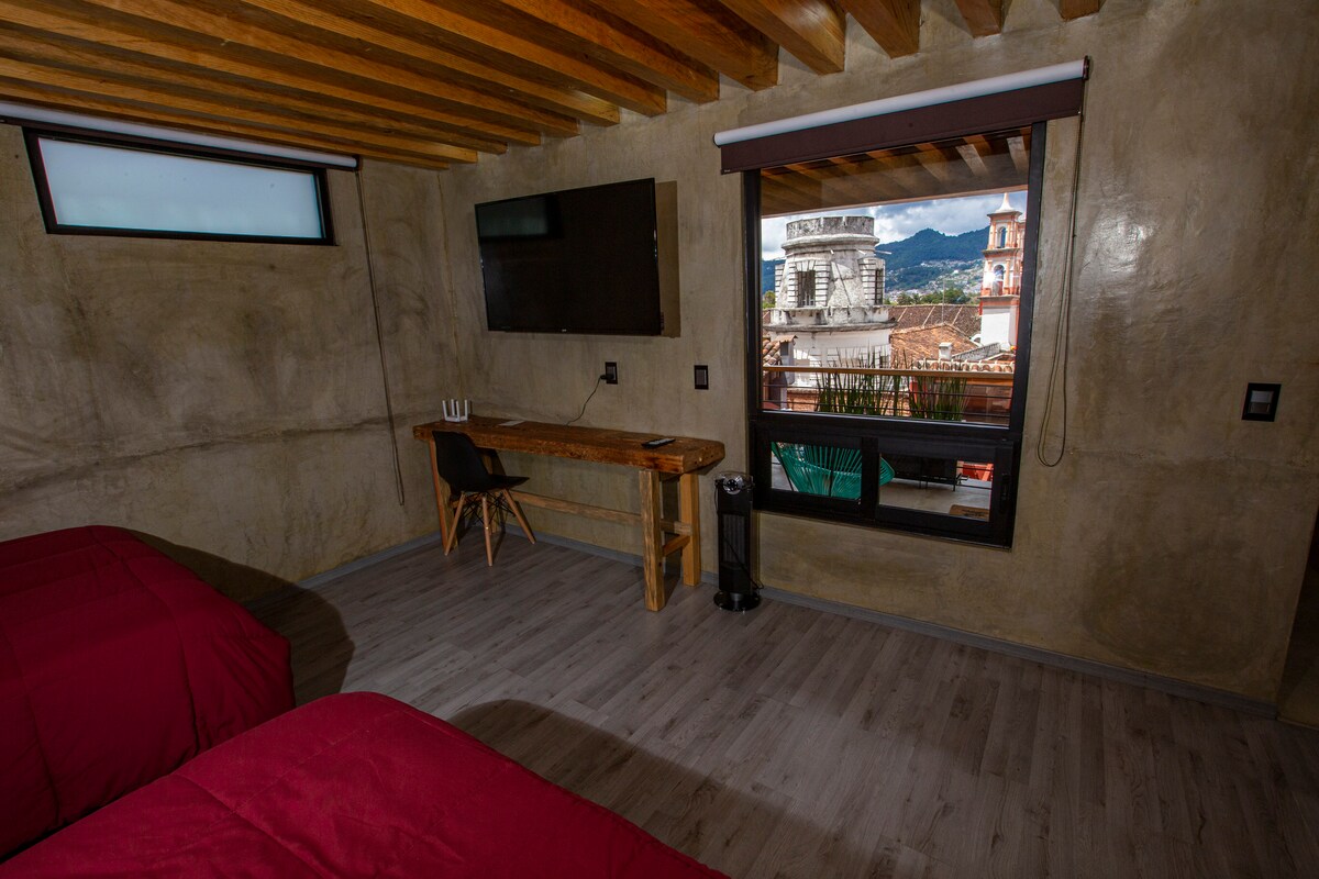 Enjoy one of the most privileged views of this beautiful city contemplating the tower and the church of mercy, as well as enjoying the sunsets of Cerro del Huitepec. We are close to the center but surrounded by natural pine trees which eliminates the hustle and bustle of the city to be in peace. Keep in mind that to get to this apartment with a spectacular view you have to climb 47 steps.