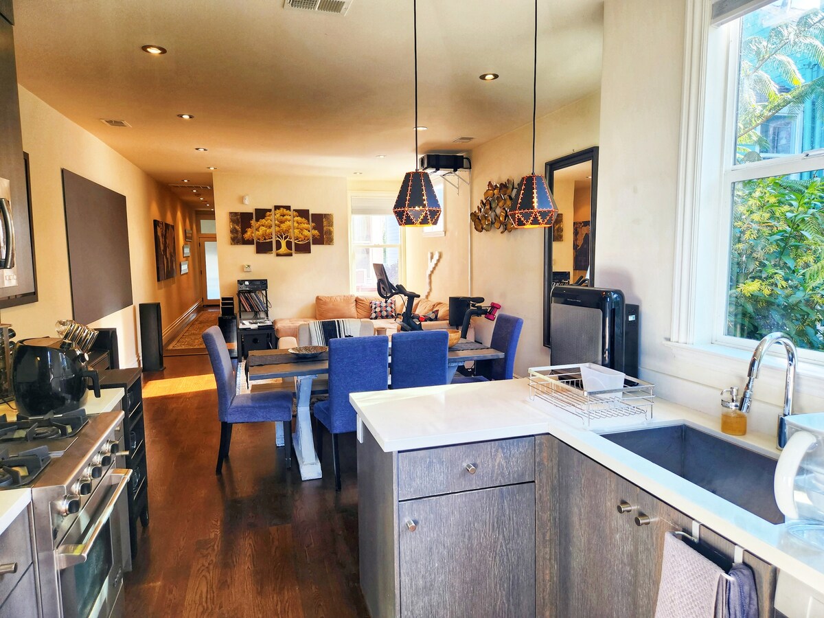 Relax in this stylishly furnished, central, updated, top-floor San Francisco apartment. Located in the Duboce Triangle neighborhood, this home is located in a safe and very central area. The apartment is spacious and surrounded by trees, making it very quiet. There’s a cute backyard and small patio out the backdoor. Inside, you’ll find a comfortable modern space with a huge projection screen and a large open plan living/dining space.