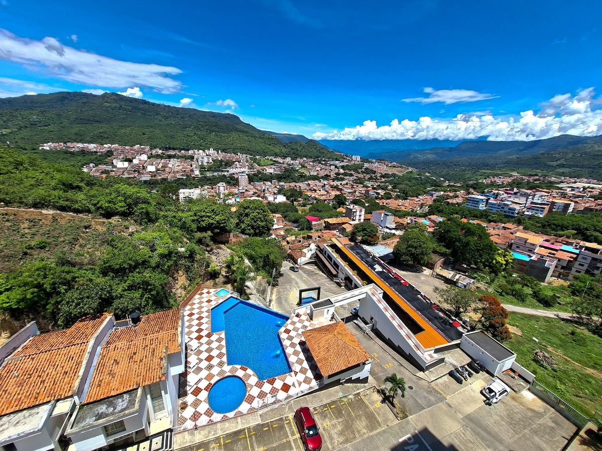 Enjoy a stylish experience in this accommodation located in an exclusive building with all the amenities and services, swimming pool, jacuzzi, sauna, club, private parking; excellent location near Barichara, Guane. Curití, Pinchote, Paramo; visit Juan Curí waterfalls, Gallineral Park, Cathedrals, Pozo Azul, San Gil market house and its smoothies; practice Bungee Jumping, Paragliding, Caving. All amenities AC, hot water, workspace, internet, television.