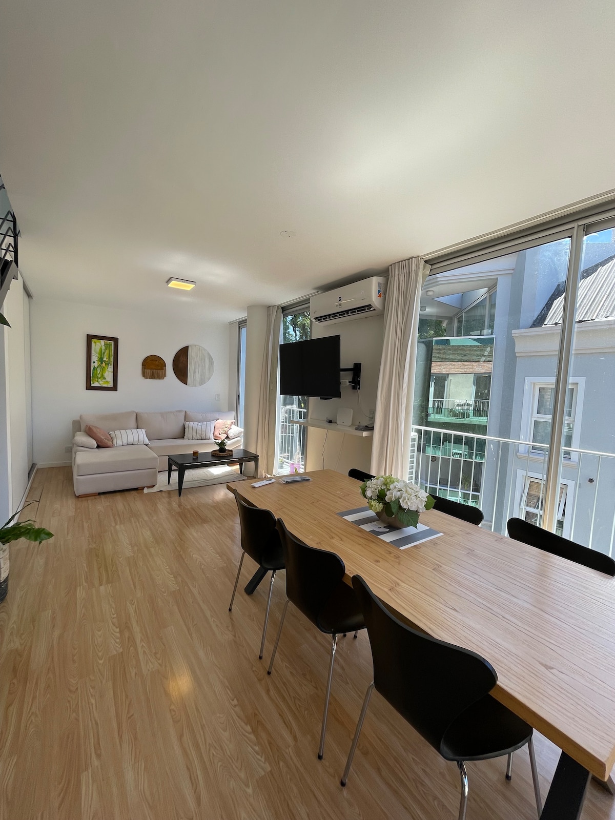 Enjoy a modern apartment in the heart of San Isidro, just 3 blocks from the train station, shopping center and the best restaurants. It has air conditioning in the living room and bedroom, a 60" Smart TV in the living room and another in the bedroom, a full kitchen and a private terrace with a grill and washing machine. Ideal for relaxing, working or enjoying with friends in a warm, bright and functional space.
