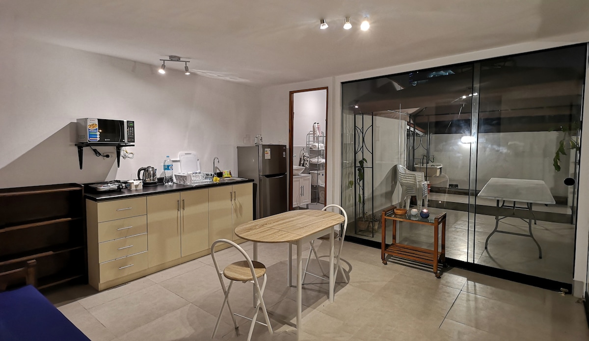 Private and independent mini apartment on the 2nd floor (access with stairs) fully furnished, consists of three rooms: Bedroom with queen size bed, large closet and desk, fiber optic WiFi, 50" Smart TV with WinTv, Kitchen/dining room, 1 sofa bed and next to it a full private bathroom. Common areas such as terrace, garden and pool are for shared use. Quiet and safe neighbourhood, private security. Close to avenues with public transport, warehouses, bank, laundry, restaurants, pharmacies, etc.