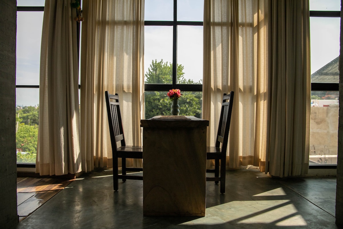 Loft, in front of the largest park in the city, next to the Hotel "Grand Fiesta Americana", 15 minutes from the temple of "Santo Domingo de Guzmán" and the best known tourist, cultural, wedding venues and entertainment attractions. Get to know the "Barrio de Jalatlaco", famous for its architecture and bohemian atmosphere. All walking. The terrace has an incomparable view of the mountains and the treetops. Design, location and functionality. An exclusive place to fall in love with Oaxaca!!
