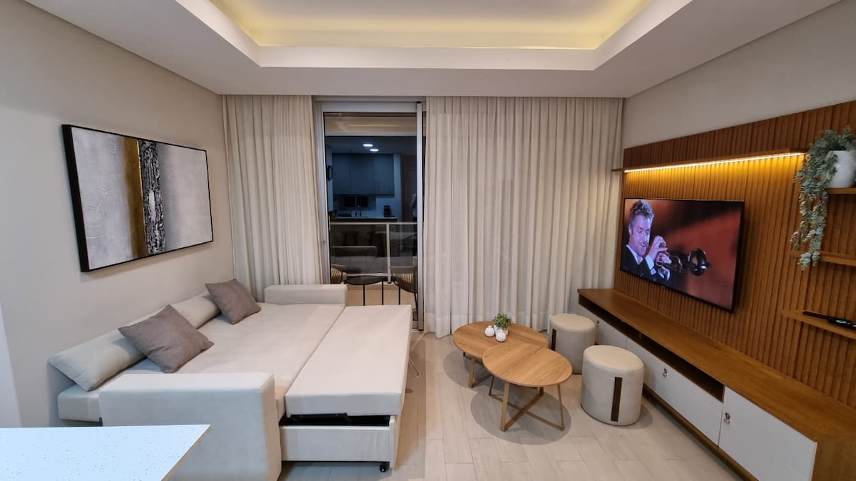 Brand new apartment in a luxury building. It has 40m² of its own, with Smart TV, WIFI, and in the building you have all the amenities: Swimming pool, air-conditioned Quincho with grill, children's playroom, equipped gym, etc. It is a 5-minute drive from the capital's most valued corporate center, and a 25-minute walk. It is also an 11-minute drive to Silvio Pettirossi Airport It has a double bed + a sofa bed. In total, up to 3 people can sleep.