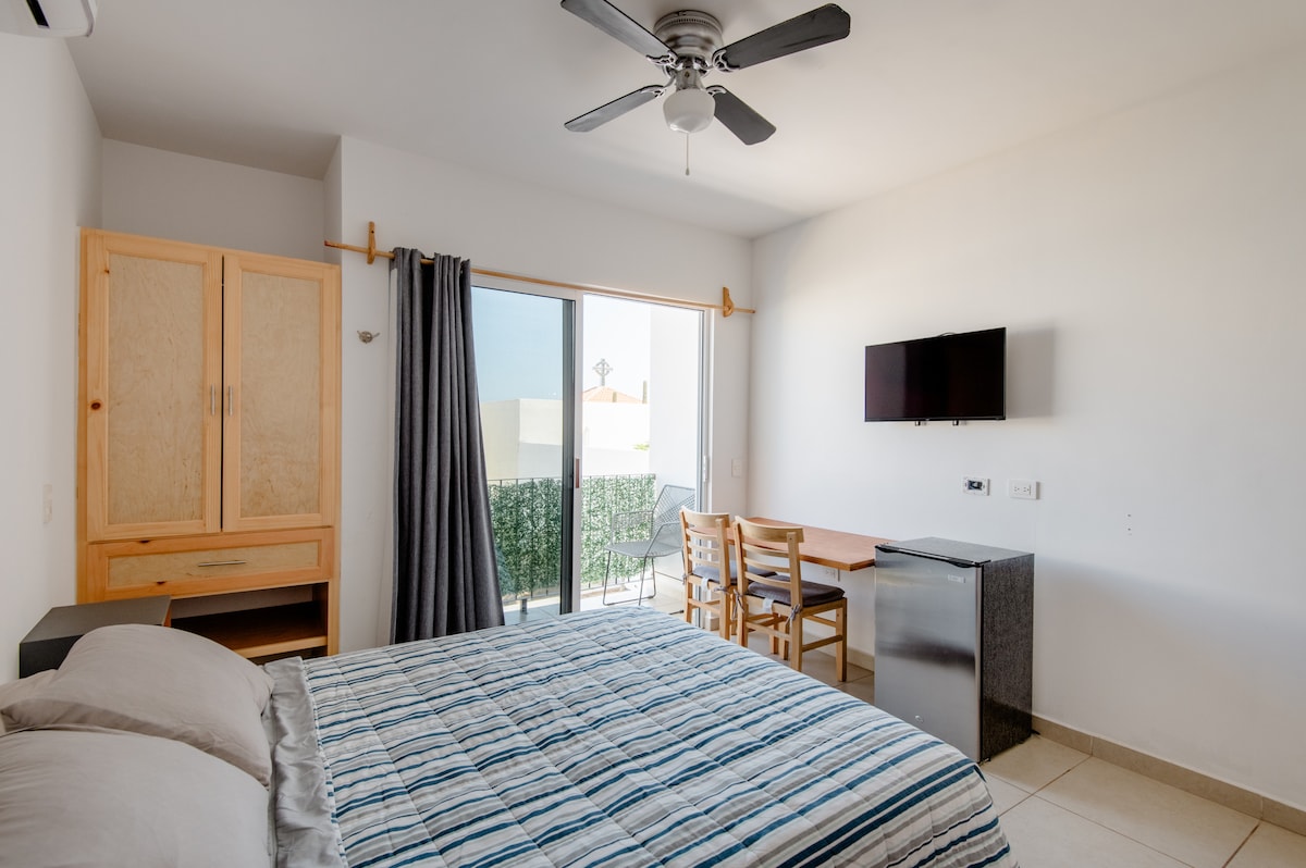 Comfortable studio for 2 people with an excellent location. Three blocks from the Transpeninsular Highway and close to downtown San José del Cabo. The studio is equipped with a kitchenette, a minibar and basic kitchen utensils, TV with Chromecast, Wifi, air conditioning, beach equipment and separate entrance.
