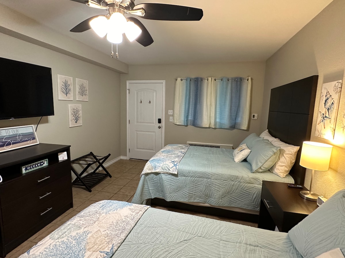 Looking for a peaceful getaway? Our relaxing 2nd floor studio condo in Fulton, TX. is the perfect place to unwind! Just steps from the Gulf, you can enjoy the pool, shuffleboard, or have a cookout while enjoying the breathtaking views! Room has two comfortable Queen size beds and a sleeper sofa. Kitchen comes equipped with everything you need to cook a quick meal. Other amenities include a refrigerator, desk, games for the kids, a Keurig, towels, shampoo. Short drive to Port Aransas and Corpus!
