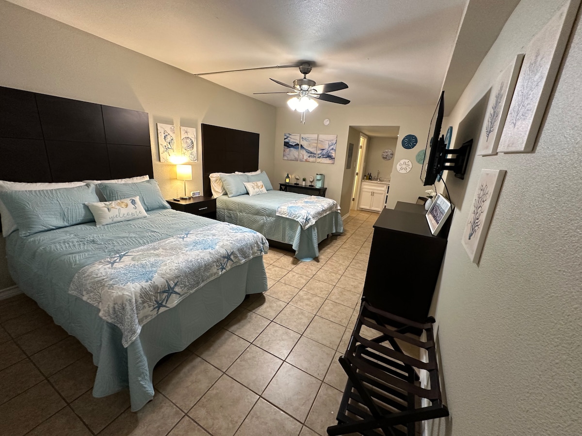 Welcome to Sunny Daze, your bayfront studio getaway in Rockport, Texas! This cozy condo features two comfy full-size beds, one bathroom, and a kitchenette equipped with a refrigerator, Keurig coffee bar, and microwave. Enjoy stunning bay views right from your door and an easy walk to downtown Fulton's lively bars and amazing restaurants. Sunny Daze is located at the Sandollar Resort steps from the Gulf with its own waterfront access and 2 swimming pools that the whole family can enjoy.