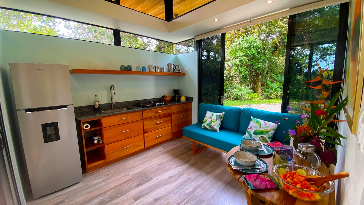 Drift off to sleep, and awaken to the gentle babble of a nearby rainforest creek, distant ocean waves, and tropical birds in resplendent tree tops. This modern but cozy 1bd/1ba comes with all kitchen essentials, BBQ, and a luxury bath featuring jungle views and double shower heads. Step outside and into the infinity-edge pool with customizable lighting and ocean views. Monkeys, sloths, toucans, coati’s, and waterfalls abound. Surround yourself with serene, vibrant, natural beauty.