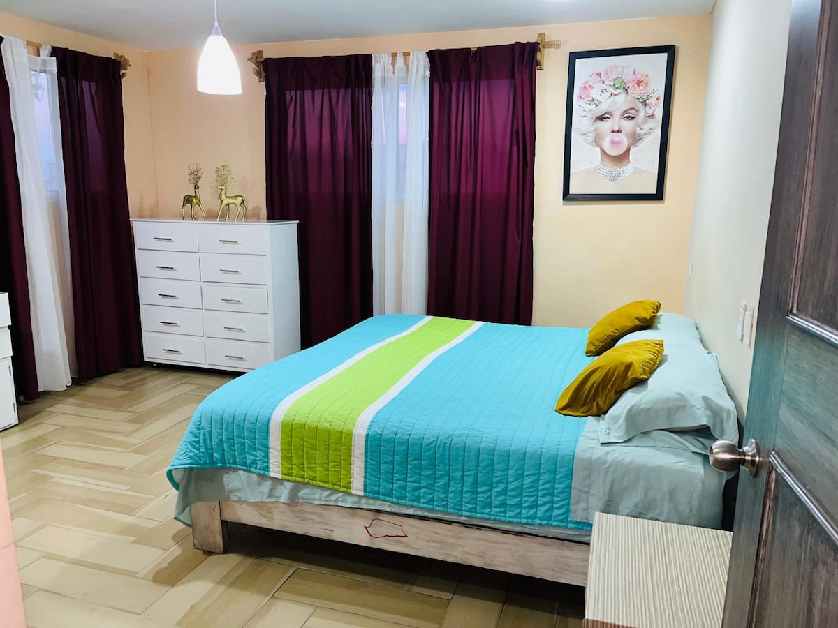 Enjoy this practical and comfortable loft 10 minutes from Mexico City Airport, GNP/Autodromo Stadium, Palacio de los Deportes, TAPO Bus Terminal, Oceania/IkEA Shopping Center with cafes, bars, restaurants, cinemas, and shops. The loft is located on the second level, with a single bed, equipped kitchen, ROKU TV, desk, safe, Wi-Fi, and a private bathroom. The building has a shared washing machine and roof garden. There is a park in front of the building.
