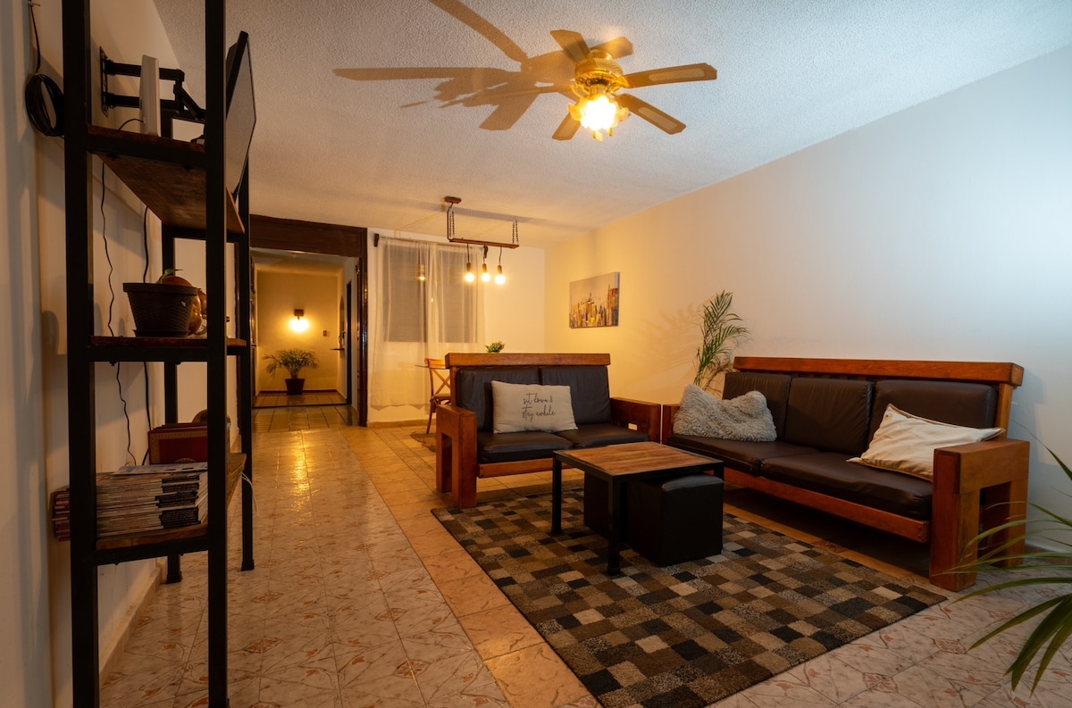 Comfortable and cozy. WE CHECK IN. Ideal for families or groups of friends. Natural light Autonomous gate Automatic door Closed for compact auto. Internet throughout the house. Recamara spacious King size bed and Smart TV sofa bed. Ceiling fan and other tower Iron and ironing board closet. Recamara with double bed closet ceiling fan. Bathroom w/hot water Jacuzzi Tina. Full and equipped kitchenette Micro wave oven, refrigerator, nutribule coffee maker. Half bathroom
