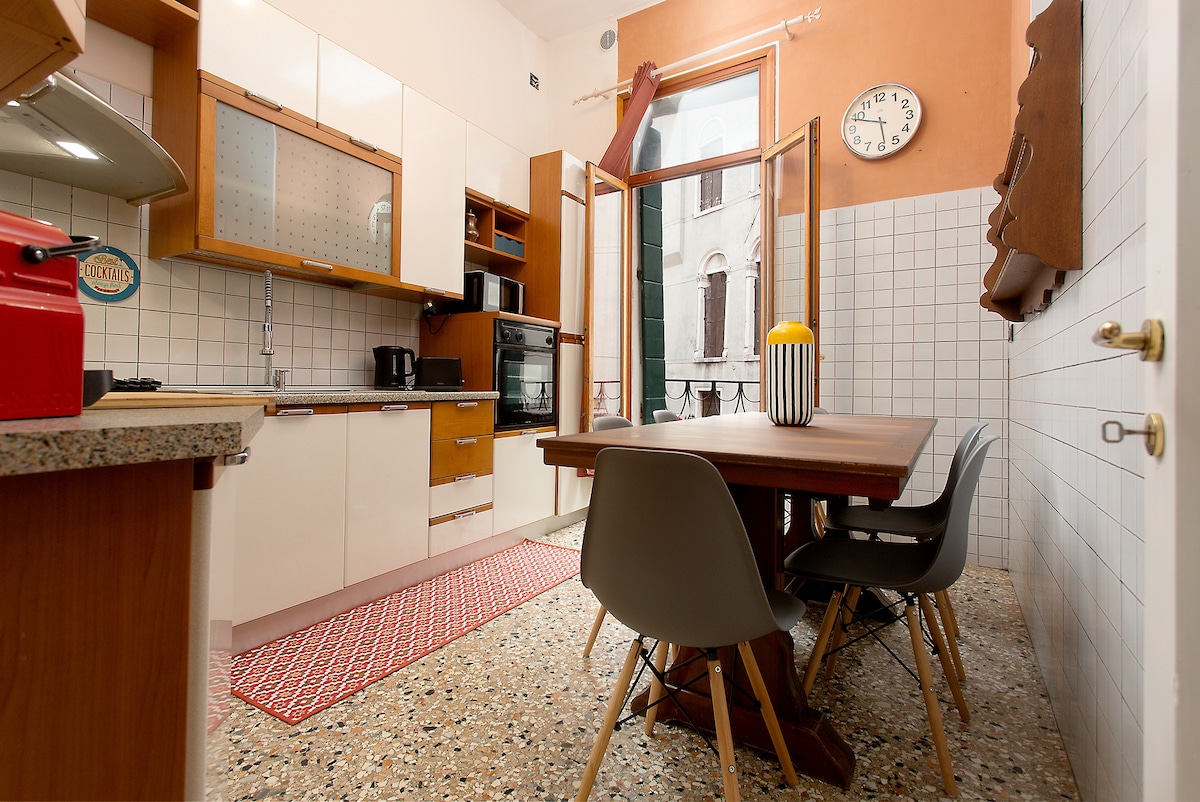 A modern 60-square-metre flat with a canal view, freshly restored maintaining classic Venetian elements (traditional Istrian stone floor and wooden ceiling), it has Wi-fi, 2 TVs, air conditioning, washing machine, hair dryer, a fully equipped steel kitchen (oven, nespresso, kettle), a living room with a sofa bed, a king-size double bed, and a fantastic bathroom.