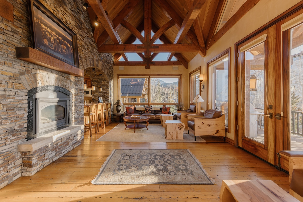 Welcome to Alpenglow Overlook at See Forever, hosted by InvitedHome. Located within the prestigious See Forever complex in Telluride, Colorado, this luxurious 3-bedroom condo epitomizes mountain sophistication with its warm, alpine-inspired design. The home features a dramatic open living area with vaulted ceilings and exposed wooden rafters, complemented by rich wood tones and multiple stone fireplaces that create a cozy yet grand atmosphere.
