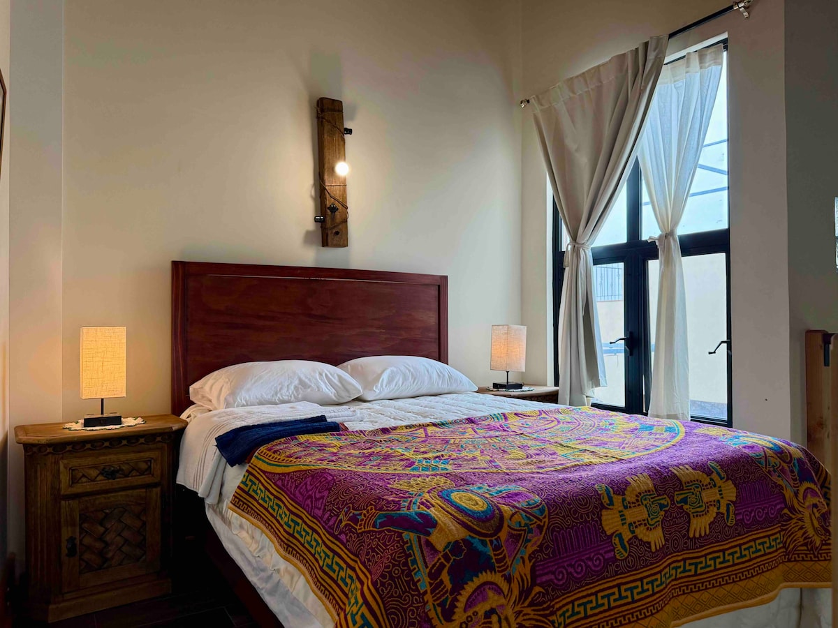 This unique place has a style all its own. Bright, cozy suite on the second floor, ideal for guests looking for a comfortable space in SMA. Accessed by stairs, this suite offers rustic charm with modern comforts: Queen bed, a cozy seating, heater and a kitchenette with an electric cooktop, refrigerator, coffee maker, and basic utensils. Private modern bathroom. Located just 2.4 km from the Parroquia, close to Plaza La Luciérnaga, Hotel Casa Primavera and public transport at your doorstep.