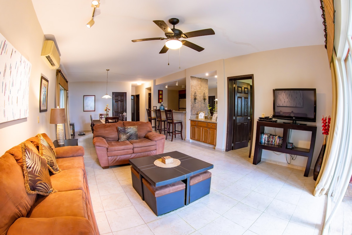 This spacious condominium is located in the Las Ventanas complex. It is on the first floor and is a 3 bedroom, 2 bathroom unit. It has 2 Full size beds in one room, a Queen size bed in the other, and a King sized bed in the master. It has everything you will need access to, including parking. I live nearby on the same property, so any problems you may have, I will be able to address promptly. The neighborhood is a gated community about a half mile from the Cozumel downtown and ferry.