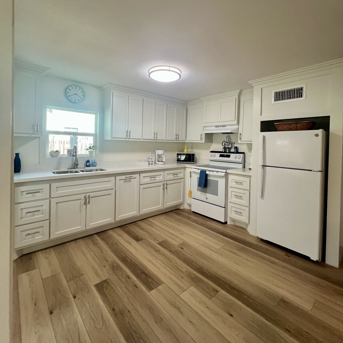 Soak up the vintage charm of this fully renovated Duplex apartment, reclaimed old wood floors, kitchen, fridge, stove/range, microwave, 2 large smart tv, living room, queen bed , modern bathroom with vessel sink limestone vanity top, private patio and yard, mature mesquite trees, dining table, table desk, a block away from Business 77, restaurants, stores, parks, walking and biking trails and the Ramsey park bird center, close to Valley Baptist Hospital and UTRGV Harlingen Campus.