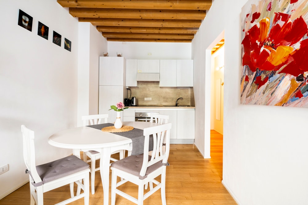 The apartment consists of a bright and airy open-space livingroom, bedroom, kitchen and bathroom with bathtub. Its main attractions are bright spaces, a gorgeous rooftop view, peace and quiet. It is part of a XVII century building a few steps away from the Grand Canal, near the Frari church, Scuola Grande di San Rocco and Carlo Goldoni's house. Easy to get to and to move around by foot or with public transportation, it is located in a lively district full of restaurants and typical bars.