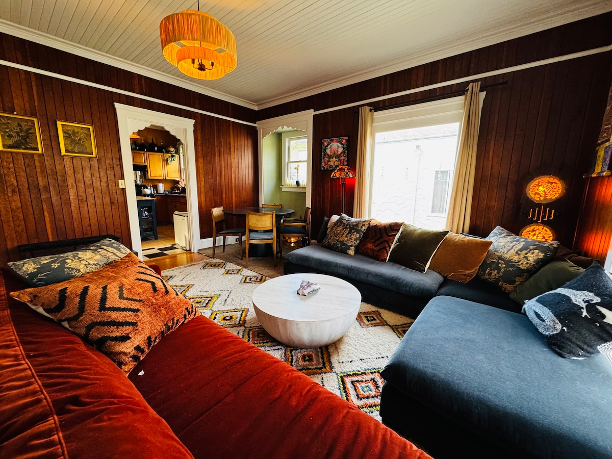 A blissful coastal retreat with unparalled ocean views, the Ocean Parkway House is nestled on a secluded bluff over looking the Pacific. This unique 1960's Bolinas beach house is a spot to truly relax and unwind. Fully updated with a curated mix of vintage and modern furnishings - our cottage has a mid-century design sensibility with luxuries like Coyuchi towels, a chef's kitchen, Scandinavian fireplace, outdoor rain shower, cedar hot tub, and new heated stone loveseat on the upstairs deck.