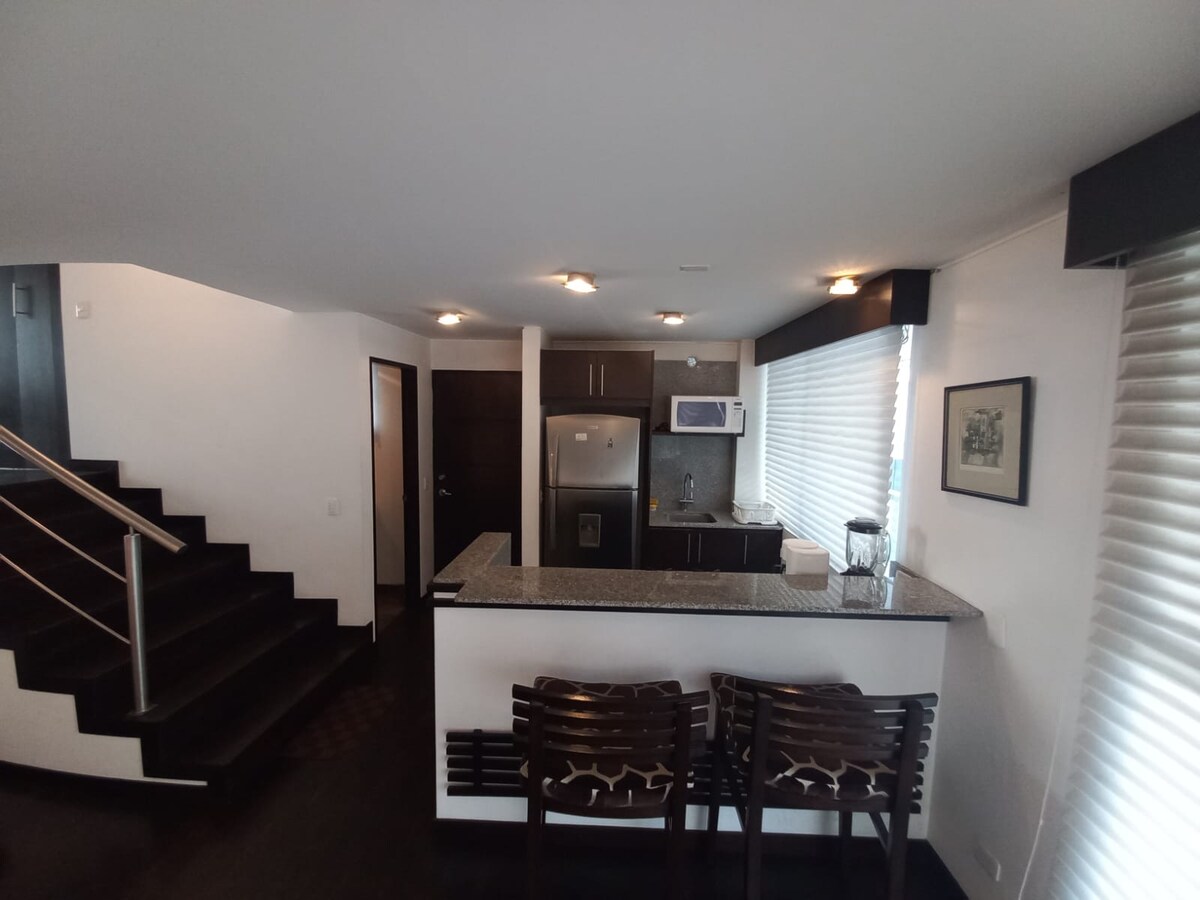 Spectacular suite located just across La Carolina Park. Imagine the view from the 17th floor, whether you're relaxing on the sofa or in bed. Features a fully equipped kitchen, fast internet, and you'll feel right at home. Easy walking access to the Subway, Mall El Jardín, and CCI. Pool - Sauna - Jacuzzi Well-equipped gym Incredible rooftop 60” Smart TV - Netflix Induction cooktop Refrigerator Laundry room inside the apartment Microwave Blackout curtains Clothes iron