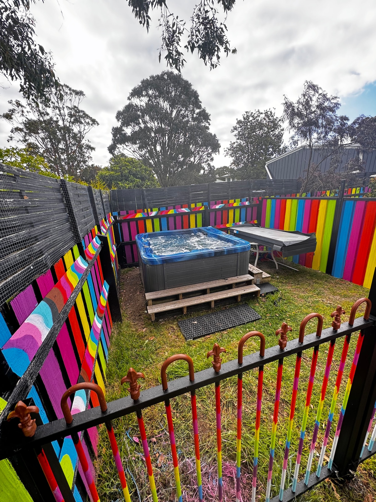 This unique 3 BEDROOM house has rainbows everywhere you look. š 2 queen beds & 1 double. This place is good for the moode, for a relaxing trip, movies at night on the TV, jacuzzi under the stars. Only 5 mins drive to popular beaches like Smiths Beach , Cowes (the main town) , reataurants , cafes & bars , Amazeā n things, tenpin bowling, nature walks , 10 mins from Penguin Parade. For peace of mind exterior survailence cameras for security cover front deck,backyard, & entry to the jacuzzi area