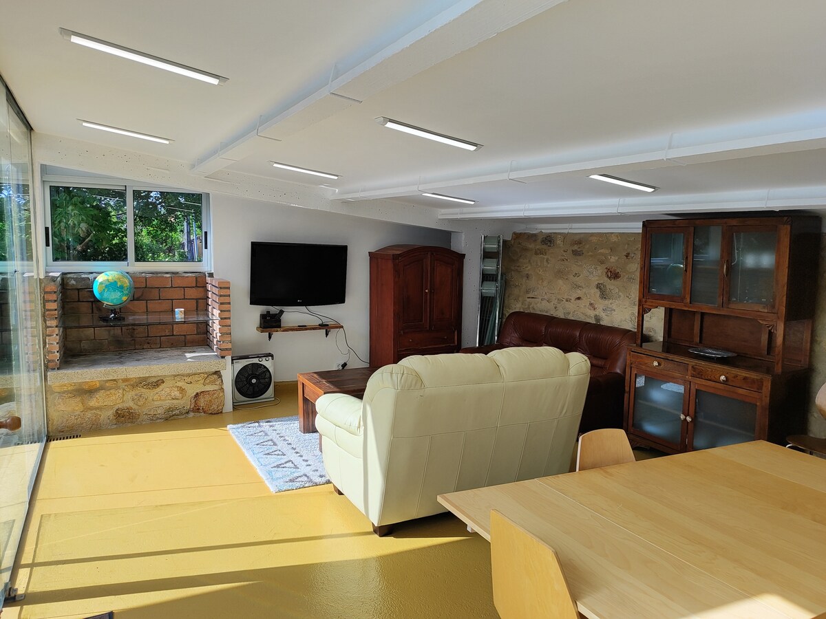 Apartment with two bedrooms, a sofa with two beds and a sofa bed. Capacity for up to six people. Independent entrance, direct access to the garden and pool. All rooms face the outside. The property is not shared with other clients. Its owners live on the upper floor and take care of the exterior cleaning. Ideal for finding tranquility and privacy. It is located on a completely enclosed property. The pool and garden area are exclusively for guests and are not shared.