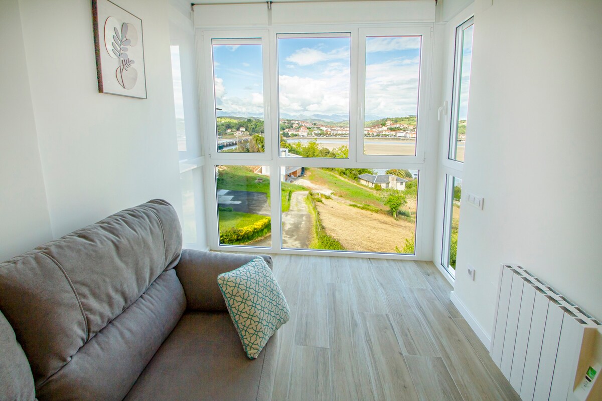 AL AIRE DEL MAR - WAVES Loft apartment with large windows facing the estuary and the bridge, it has great views and lots of light, ideal for disconnecting and enjoying the surroundings in the garden. It has a double bed and a sofa bed, so it is perfect for a couple with a child. We hope you enjoy your stay to the fullest. You are all welcome, we respect diversity and inclusion.