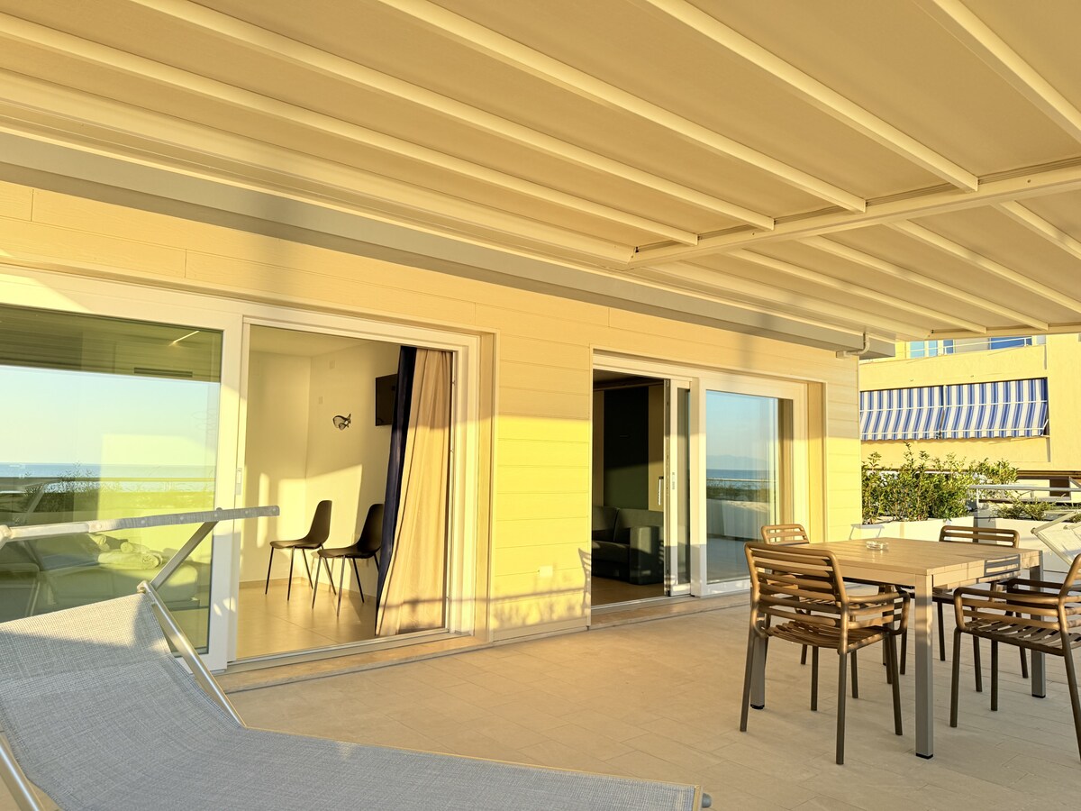 La nostra suite al piano primo caratterizzata da un esclusiva terrazza privata di 40 mq sul mare vi farà godere dall'alba al tramonto la brezza marina. Si compone di due zone, cucina soggiorno con divano letto e zona notte con bagno con possibilità di aggiungere un terzo letto. Può ospitare comodamente coppie, famiglie con massimo 2 bambini e viaggiatori singoli. Ogni alloggio include il servizio spiaggia allo stabilimento balneare Florida con ombrellone e due lettini.