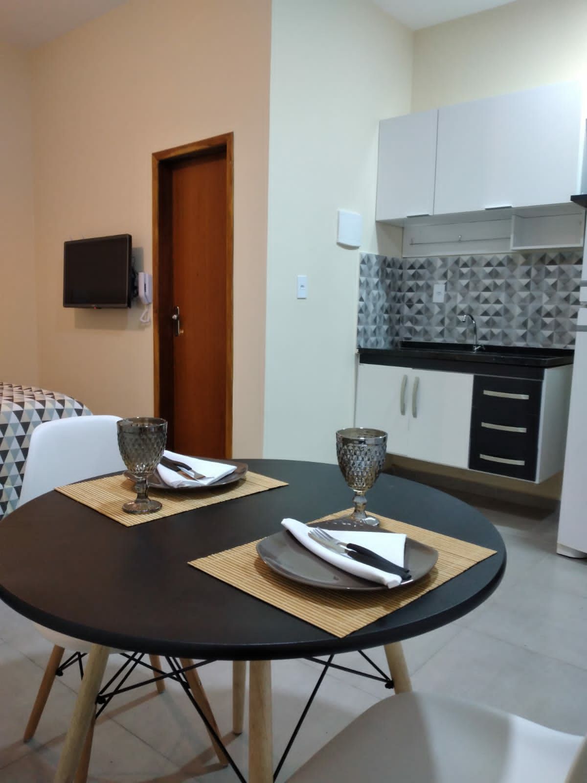 Relax with the whole family at this peaceful place to stay. New flat, with new furniture, comfortable bed, air-conditioning, ceiling fan, 32" smart TV with cable TV and Netflix. Kitchen equipped with a microwave, refrigerator, coffee maker, sandwich maker, plates, glasses and cups. Flat with a hammock for relaxation and a table on the balcony. Bathroom with stall and electric shower. Parking for up to 5 cars and a shared barbecue area.