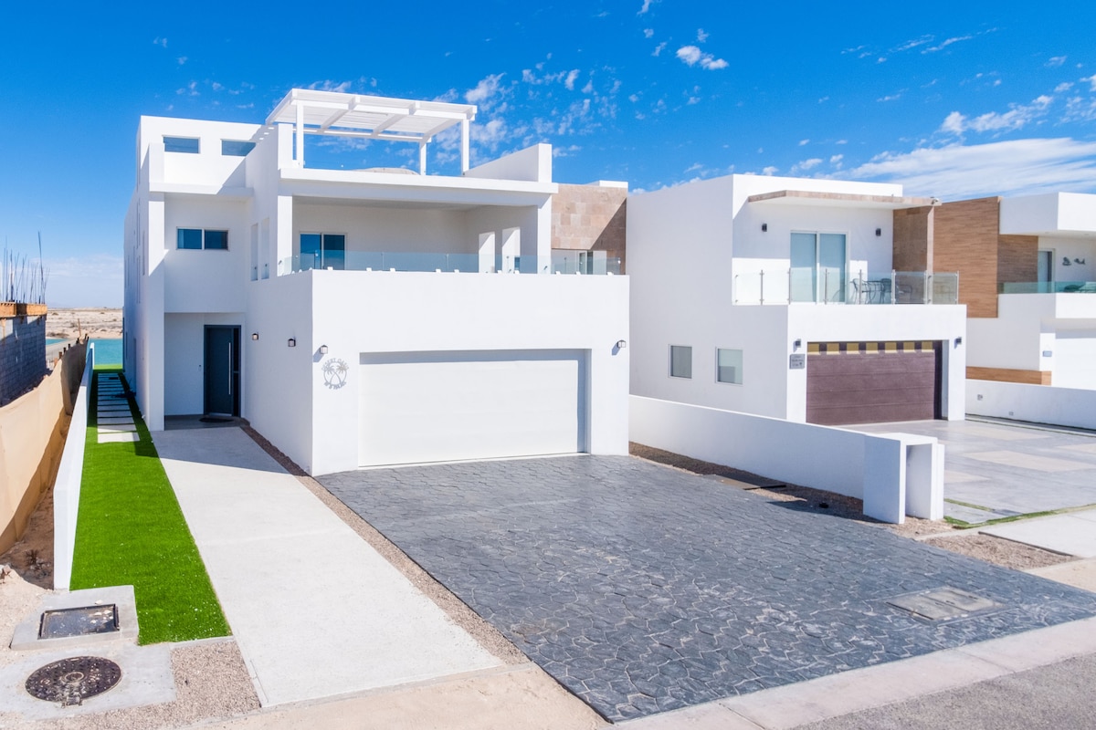 Early check in may be available. Beachfront home located on the Sea of Cortez. All 5 ensuite bedrooms are complete with king beds, luxury linens, custom blackout window coverings, flat screen TV’s, Wi-Fi and view balconies. You’re sure to love the ocean front private pool and hot tub, beach front access with beautiful ocean and sunset views! Ask us about our guest discount for golf at the Jack Nicklaus Signature Golf Course within our community of Islas Del Mar with 24 hour security.