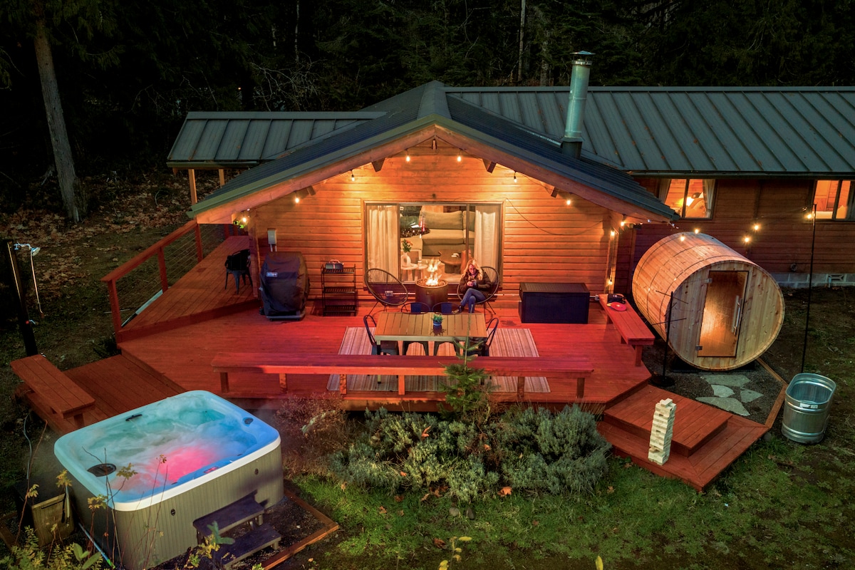 Escape to the Happy Fox Cabin in Rhododendron, Oregon at the base of Mt Hood in PNW! Near Government Camp and only 45 minutes from Portland airport. A fully equipped cabin with high end amenities. Unwind outside to the sounds of a running creek, soak in the hot tub under the stars, or gather around the fire pit. Hike or bike on hundreds of nearby trails, ski at Timberline, Skibowl or Meadows or paddleboard and kayak at Trillium Lake. Plenty of amazing local restaurants and conveniences!