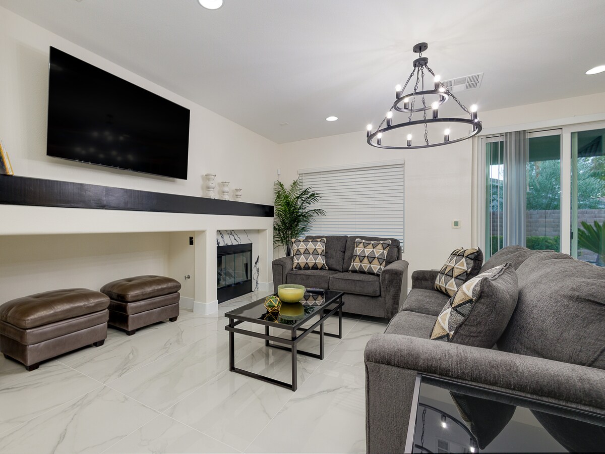 Welcome to my modern completely remodeled 1900 square foot house!. Basketball court, golf putting green and a decking with a strip view. Sunken pit sitting area. House was built in 2019 and nobody lived in it until 2022. Amazingly beautiful views from the backyard and house. Very spacious and accommodates up to 8 people comfortably. 25 foot heatable pool and jacuzzi. High speed internet and a basic cable subscription. Each bedroom has it's own smart TV and the living room has a huge smart TV.