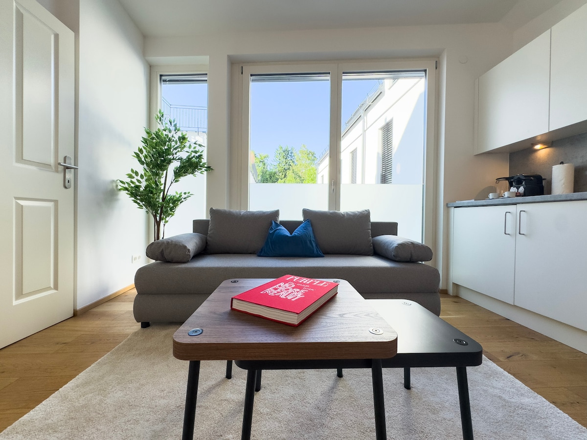 Enjoy a charming stay in a luxurious private apartment with a bedroom and living room with a private outdoor terrace with a direct view of the Danube River and the Vienna International Center with a private and secure parking lot in the basement of the building. You can end your day by relaxing on the terrace and enjoying the magnificent view of the Danube. You can also cook your favorite dishes in a modern kitchen with everything you need. The apartment is in an excellent location with easy access to anywhere in Vienna, only 400 meters from Millennium City, and it has a complex of restaurants, cafes, and shopping stores, and there is a Hofer supermarket just a few steps away.