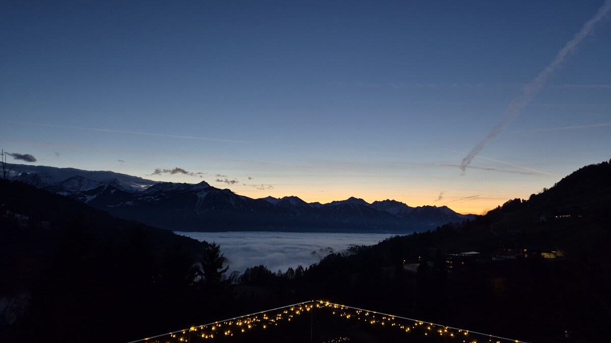 Urlaub in den Alpen Unsere neu renovierte Ferienwohnung in den Bergen (1000 m ü. A.) stellt für jede/n eine warme und mit viel Liebe zum Detail eingerichtete Bleibe zum vernünftigen Preis dar. Im selben Haus gibt es noch eine weitere, komplett getrennte Wohnung, die ebenfalls gemietet werden kann. Die Wohnung selbst ist von außen schlecht einsehbar. Der Ausblick auf die Schweizer Berge ist fantastisch. Abendrot geniessen oder am Beamer einen Film geniessen.