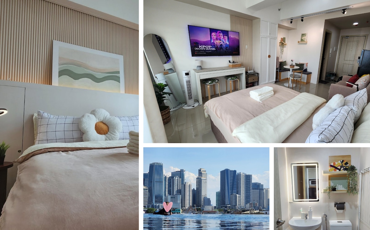 Enjoy a cozy stay with panoramic views of the Pasig River and Makati skyline. Features include a private balcony, modern interiors, and access to a stunning indoor infinity pool, gym, and other premium amenities ❤️ Location: Harbour Park Residences, Mandaluyong What's Included: Private Toilet & Bath SMART TV with Netflix Dining Set Mini bar Fully Equipped Kitchen: Utensils Rice Cooker Microwave Tableware Refrigerator Fully Air-Conditioned 100mbps WiFi Cooking allowed