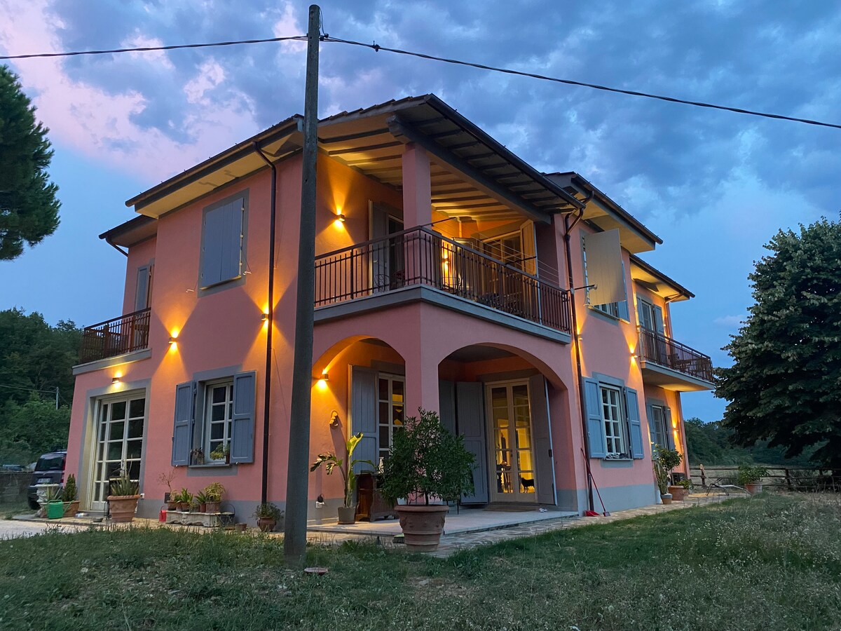La casa è disposta su 2 piani, la parte inferiore camera da letto grande e camera piccola corridoio due bagni, cucina corte giardino al primo piano tre camere da letto con due bagni portano alla parte superiore grande stanza con camino tipico toscano con piano cottura soffitto a cassettone pavimento in cotto danno una calda sensazione di accoglienza.