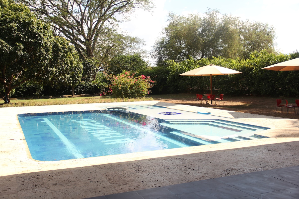 La Dicha: Private Estate in Santa Fe de Antioquia Only 5 minutes from the historic center Enjoy the tranquility of our estate in Santa Fe de Antioquia. With a capacity for 14 people, it has 5 air-conditioned bedrooms, 4 full bathrooms, a swimming pool, BBQ and kiosk. Surrounded by nature and fruit trees. It's ideal for relaxing or exploring the historic village. Includes Wi-Fi, parking, and a butler at your disposal. The perfect place to disconnect and enjoy!