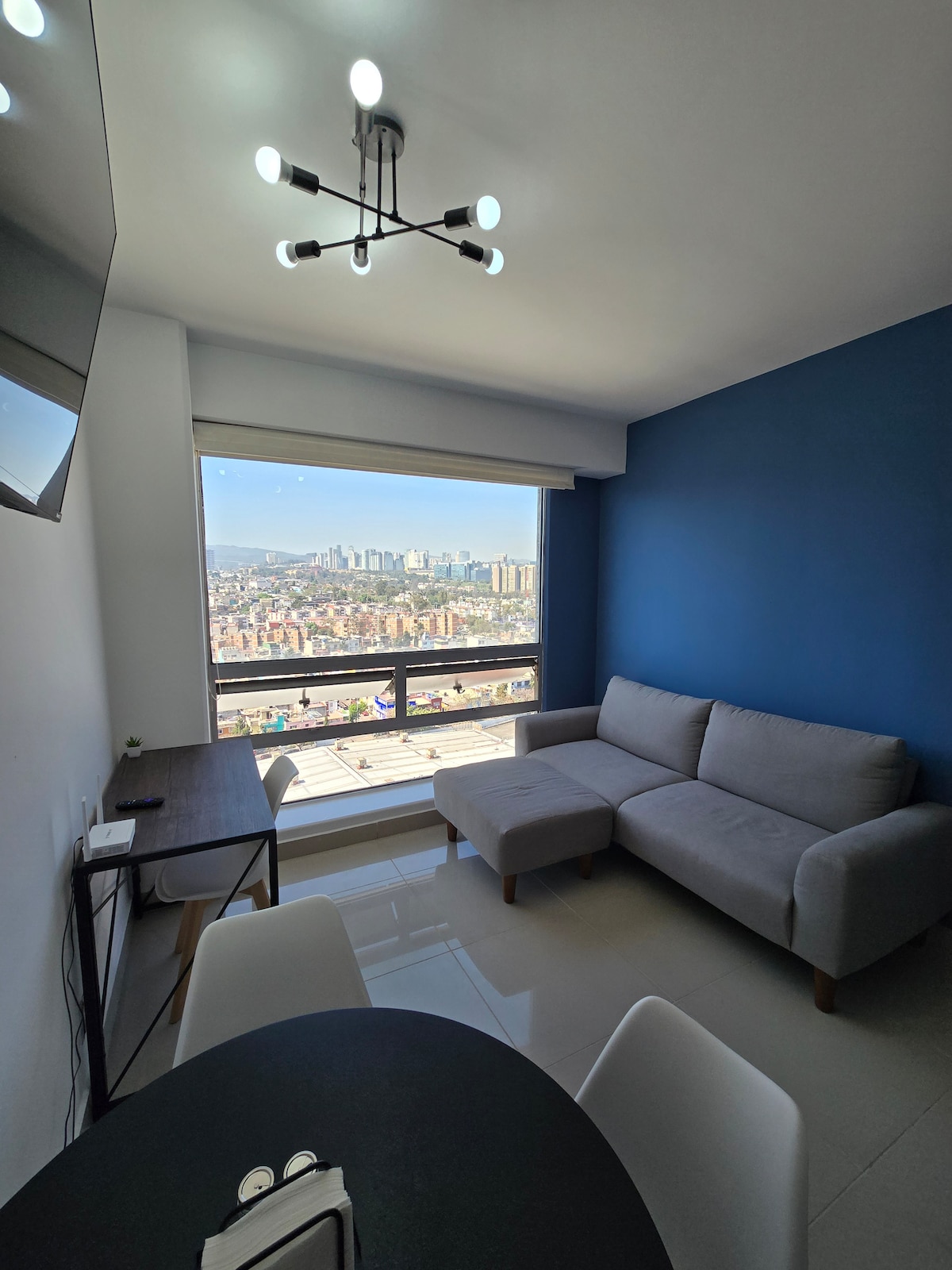Luxury apartment in La Cité, Santa Fe, with great views, designer finishes and self check-in with smart lock. 10 minutes from Santa Fe Shopping Center and ABC Hospital. Fast internet over 100 Mbps, queen size bed and sofa. Amenities: gym, dog area and shopping area. Includes a parking space and there is 24/7 guarded public parking. Pet friendly (small pets, max. 1). Ideal for long stays; ask us about discounts.