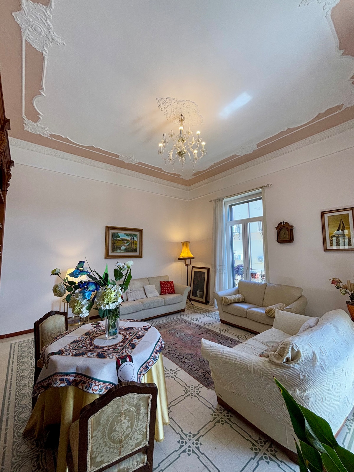 Luxury historic apartment with frescoed master bedroom in Palazzo Natoli (1765), steps from Palermo Cathedral. Two bedrooms (master frescoed, second with en-suite), two bathrooms, spacious living with balcony on Corso Vittorio Emanuele. AC, Wi-Fi, 55” TV, soundproof windows. Welcome breakfast basket included. Perfect for couples, families, and city breaks.