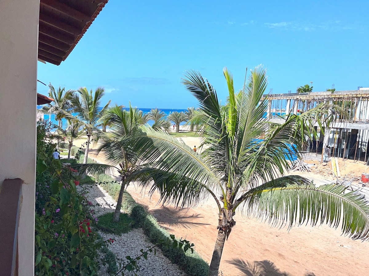 Apartamento em local tranquilo, a menos de 100 metros de uma das melhores praias da Ilha do Sal e a trezentos metros da animada Santa Maria. Este espaço simpático tem uma decoração simples, com uma decoração, onde impera a natureza, em harmonia com todo o espaço envolvente,vque transferem a energia e boa disposição. Tomar o café na varanda, contemplar a paisagem do verde que envolve a zona da piscina, espreitar entre palmeiras a ver o brilho da água, faz pensar que a vida é bela.