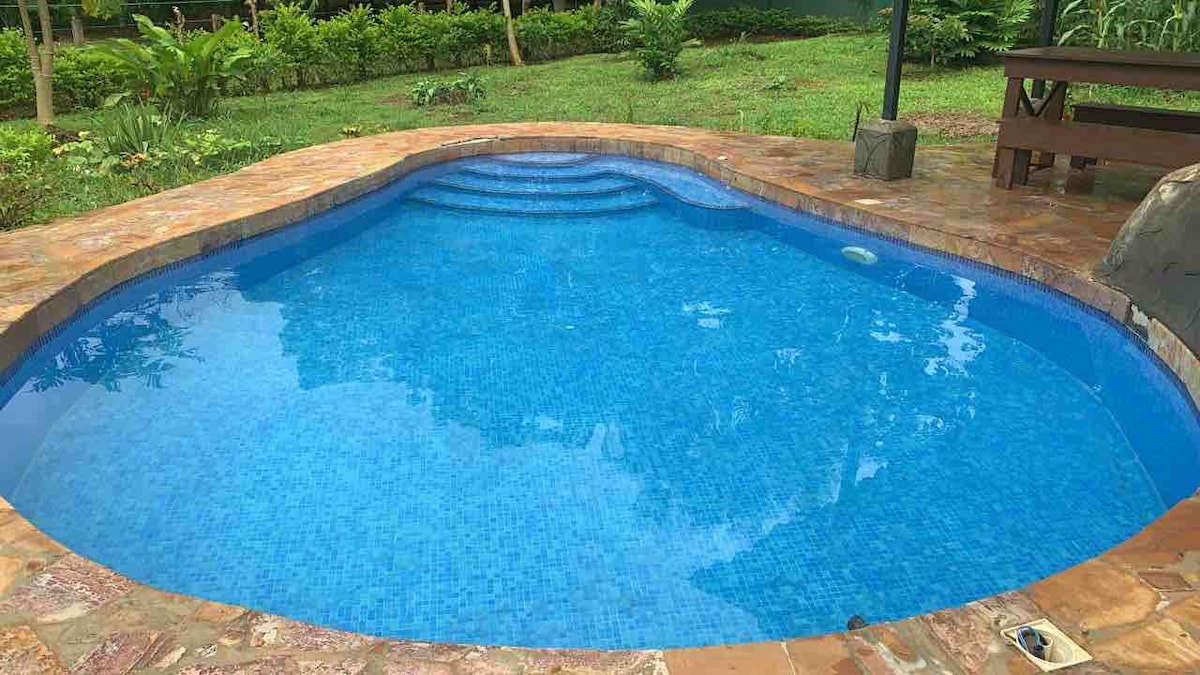 Private house in a 3000 m2 lot just on main road, for families or friends who want to rest in a natural rainforest environment, a step away from restaurants, bars and supermarkets. Different activities near the place (canopy, rafting, bird watching, frogs, hiking, river fishing) The house has a grill and independent entrance. Also pictures taken from surrounding areas. It will be a pleasure to have you in our house and make your experience in Costa Rica something unforgettable.