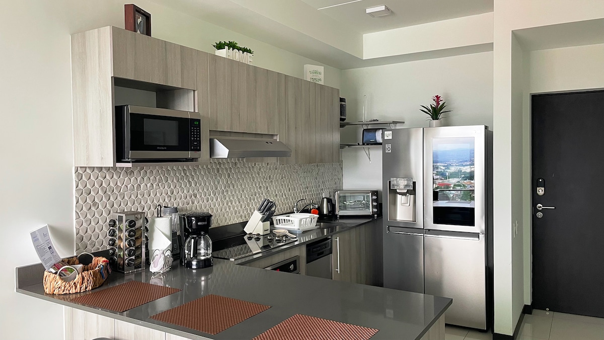 Brand new luxury apartment at Nucleo Sabana. It has a minimalist style with all the appliances brand new, including A/C, 2 smart TVs. High speed internet with TVservice. Laundry room includes a washer/dryer, 2 in 1. It has a wonderful view to the top of the trees and the sky in the balcony. There is a river next to it so you can always enjoy the river sound. Complex: More than 30 amenities, including a gastronomic market(NucleoGastro). Located 10min from Juan Santamaría Int’l Airport (SJO).