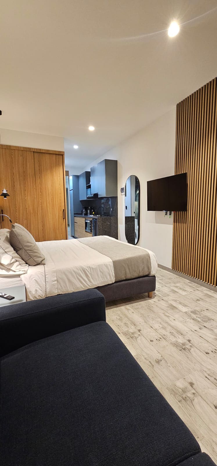 Enjoy a stylish experience at this centrally-located, modern, and luxurious place. Treat yourself to a warm and cozy stay in a space designed for those who deserve it in the best part of the city. Living room with sofa bed and guest bathroom, work area, Wi-Fi, dining room, kitchen, laundry area, master bedroom with bathroom In addition to your comfort, you'll be close to supermarkets, shopping malls, restaurants, parks, drugstores, bars, cafes, public transportation, and aerial cable.