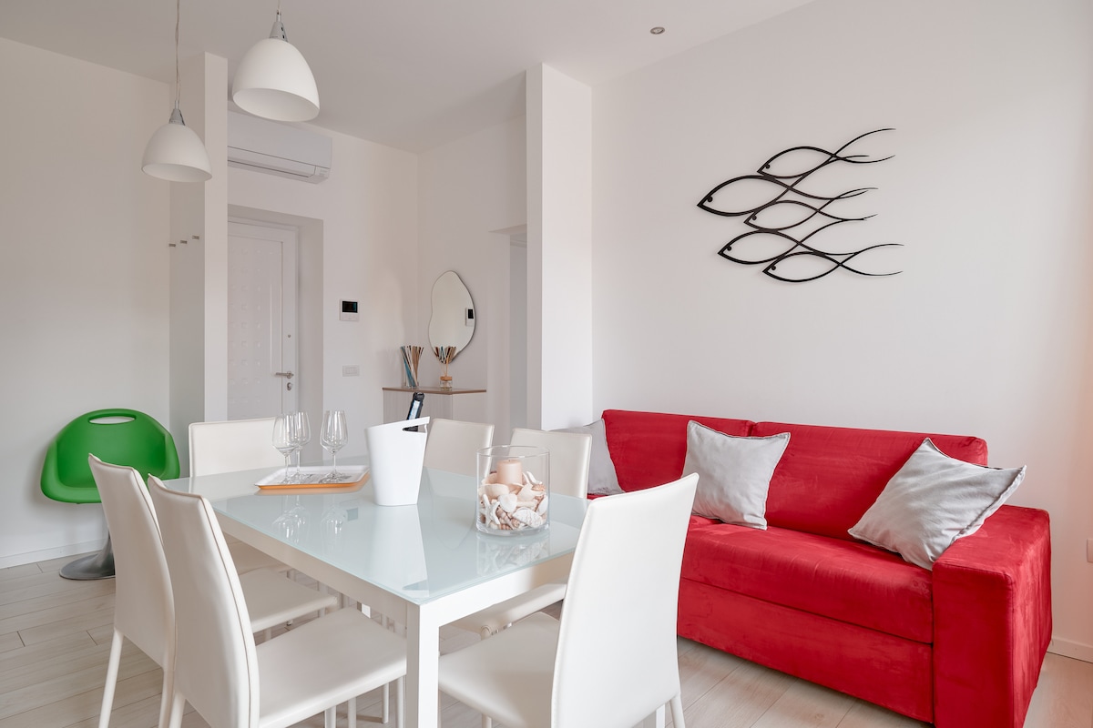 Splendido appartamento finemente arredato, a pochi passi dalla spiaggia del paese. Situato al primo piano, è separato da due stanze indipendenti con corridoio in comune. Soggiorno, cucina e veranda, tutti con vista mare. Salendo una comoda scala a chiocciola, si accede alla camera matrimoniale con bagno e un ampio terrazzo con vista mozzafiato. Tutti gli ambienti sono dotati di aria condizionata e wi-fi. Bar, ristoranti, gelaterie, minimarket, farmacia si trovano nelle immediate vicinanze.