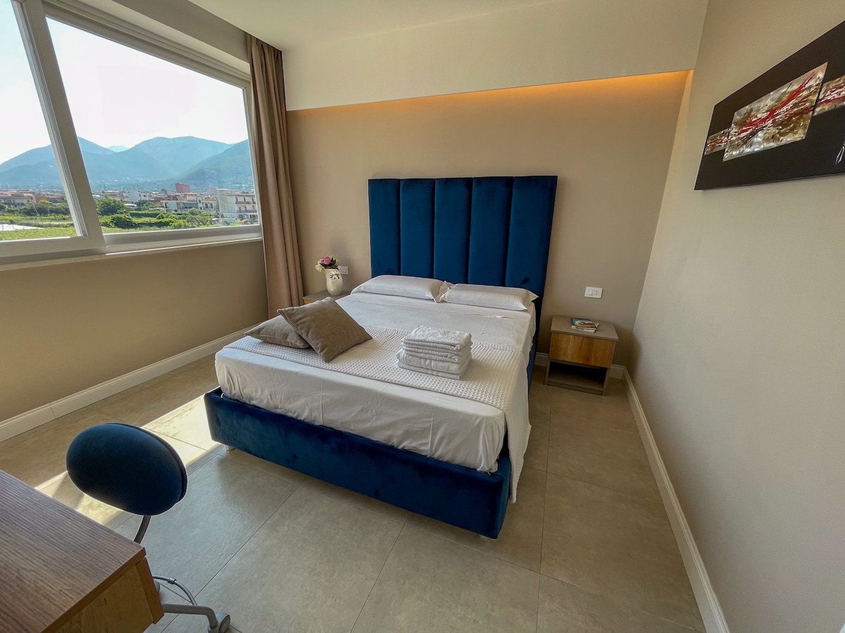 Apartment Pompei, situato nello storico Palazzo De Gregorio. La casa è ultramoderna, dotata di: Navetta aeroportuale, PARCHEGGIO CUSTODITO,aria condizionata, wifii, smartTV, solarium. Noleggio scooter, auto. L'appartamento si trova in una posizione strategica a 400m dall'uscita dell'autostrada, 10 minuti da Pompei, a 4 km da Castellammare di Stabia, 50 minuti da Napoli ed è facilmente raggiungibile Monte Faito, Sorrento, Amalfi, Positano e i collegamenti con Capri, Ischia, Procida