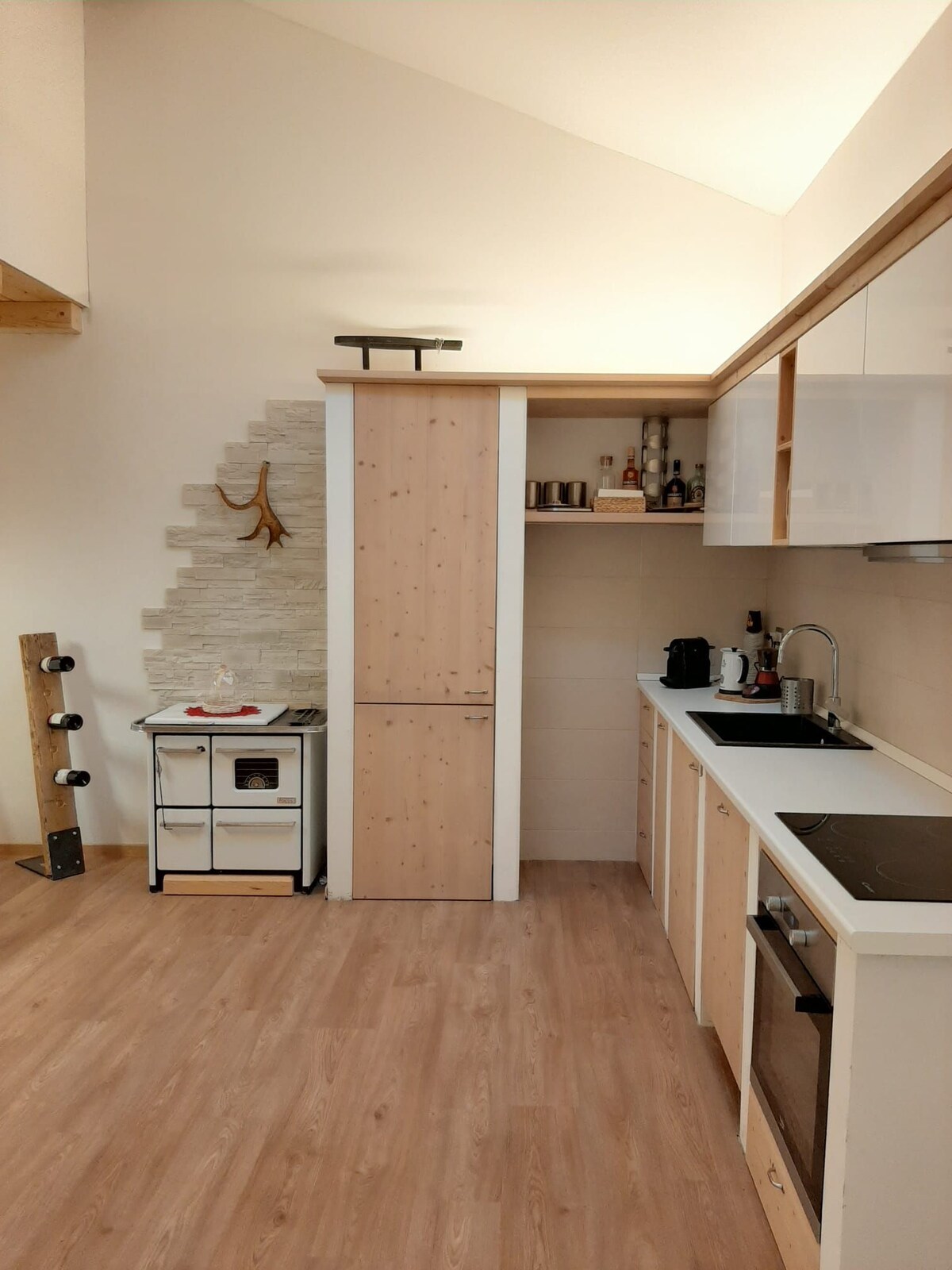 The apartment is located in front of magnificent vineyards, overlooking the beautiful Val di Non. Equipped with a bright and spacious kitchen-living room with double sofa bed and extendable dining table. The kitchen is modern and fully equipped, with a peninsula and a beautiful window overlooking the garden. In addition, a large double bedroom with a warm and relaxing infrared sauna inside. An elegant windowed bathroom with LED-illuminated shower. Private parking.