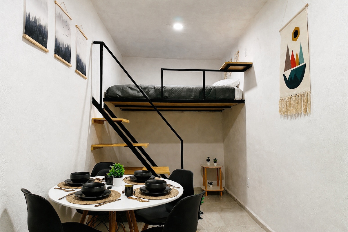 Loft moderno y completamente equipado en el corazón del Centro Histórico de Querétaro. Ideal para parejas, viajeros de trabajo o estancias medias. Cuenta con: • Tapanco con cama QS • Sofá cama matrimonial • Aire acondicionado • Cocineta equipada • Baño completo privado • Comedor para 4 personas • TV y excelente ubicación A solo unos pasos de restaurantes, cafés, museos y todo lo mejor del centro. Perfecto para disfrutar la ciudad caminando o trabajar cómodamente durante tu estancia.