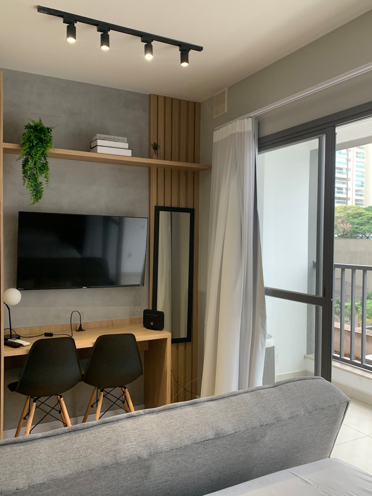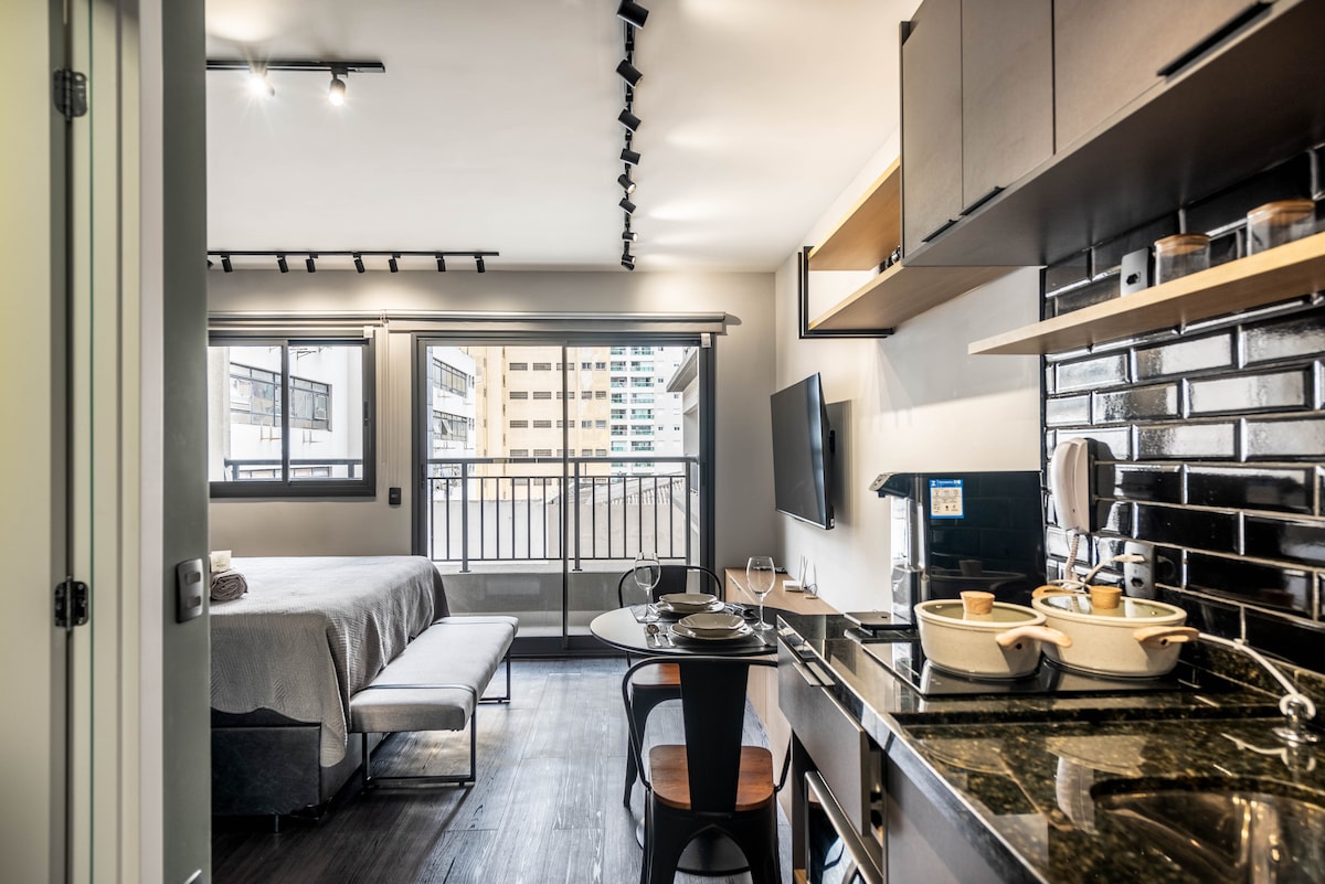 Discover urban charm, a modern and minimalist studio in the heart of São Paulo, designed for those who value design, practicality and coziness. Every detail has been carefully chosen to create a unique experience — from dark tones such as gray, black and graphite that convey elegance and modernity to the strategic lighting that enhances the environment. This studio is located in the heart of São Paulo, close to charming cafes, renowned restaurants and a vibrant nightlife.