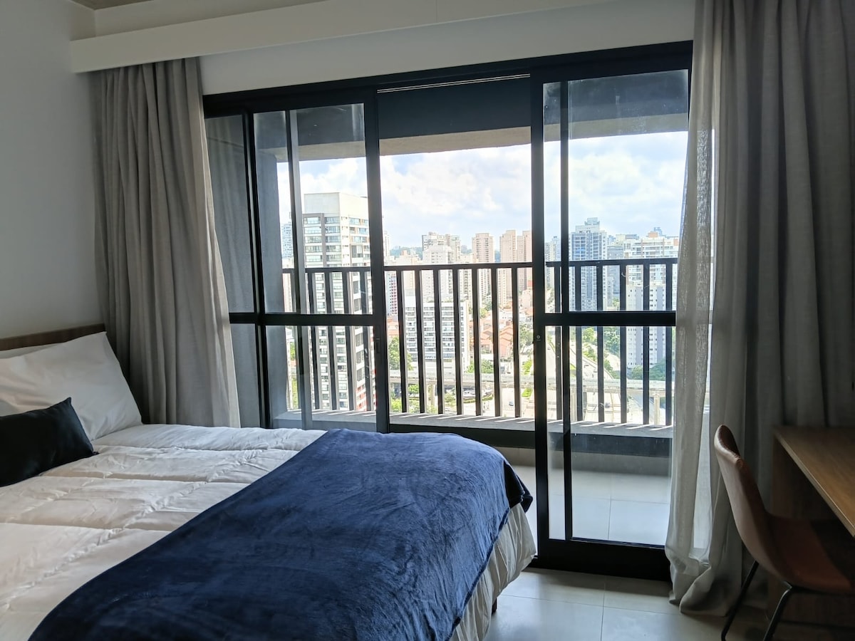 Equipped studio with a view (24 sq. meters - 16th floor). The apartment is next to the Brooklin subway station, and 12 minutes by car to Congonhas Airport. >> Nearby places: . Paulista Equestrian Center . Einstein Clinic . American Consulate >> Nearby shopping malls: . Morumbi Mall . Shopping D&D . Ibirapuera Mall . JK Iguatemi Mall >> You will have in the condominium: . Front desk 24/7; . Gym; . OMO Laundry; . Coworking; . Mini market