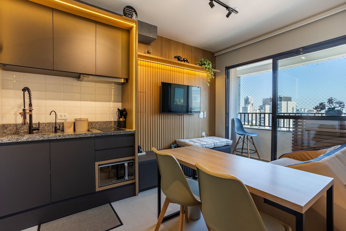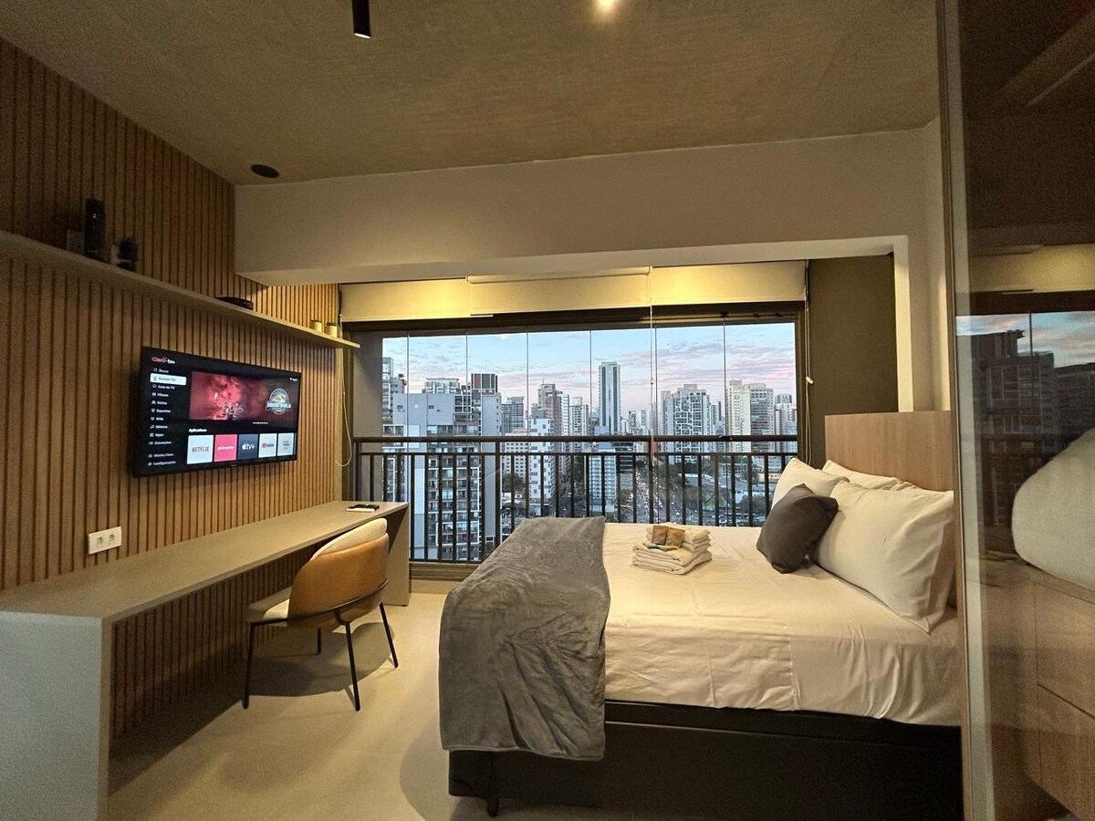 Studio equipped with a view (34m2 - 18th floor). Apto is next to Metro Brooklin Station, and 12 minutes by car to Congonhas Airport. . >> Near places: . Hípica Paulista . Clínica Einstein . American Consulate >> Nearby Shopping malls: Morumbi Mall . Shopping D&D . Shopping Ibirapuera . Shopping JK Iguatemi >> You will have in the condo: Front desk 24/7; . Gym; . OMO laundry; . Coworking;