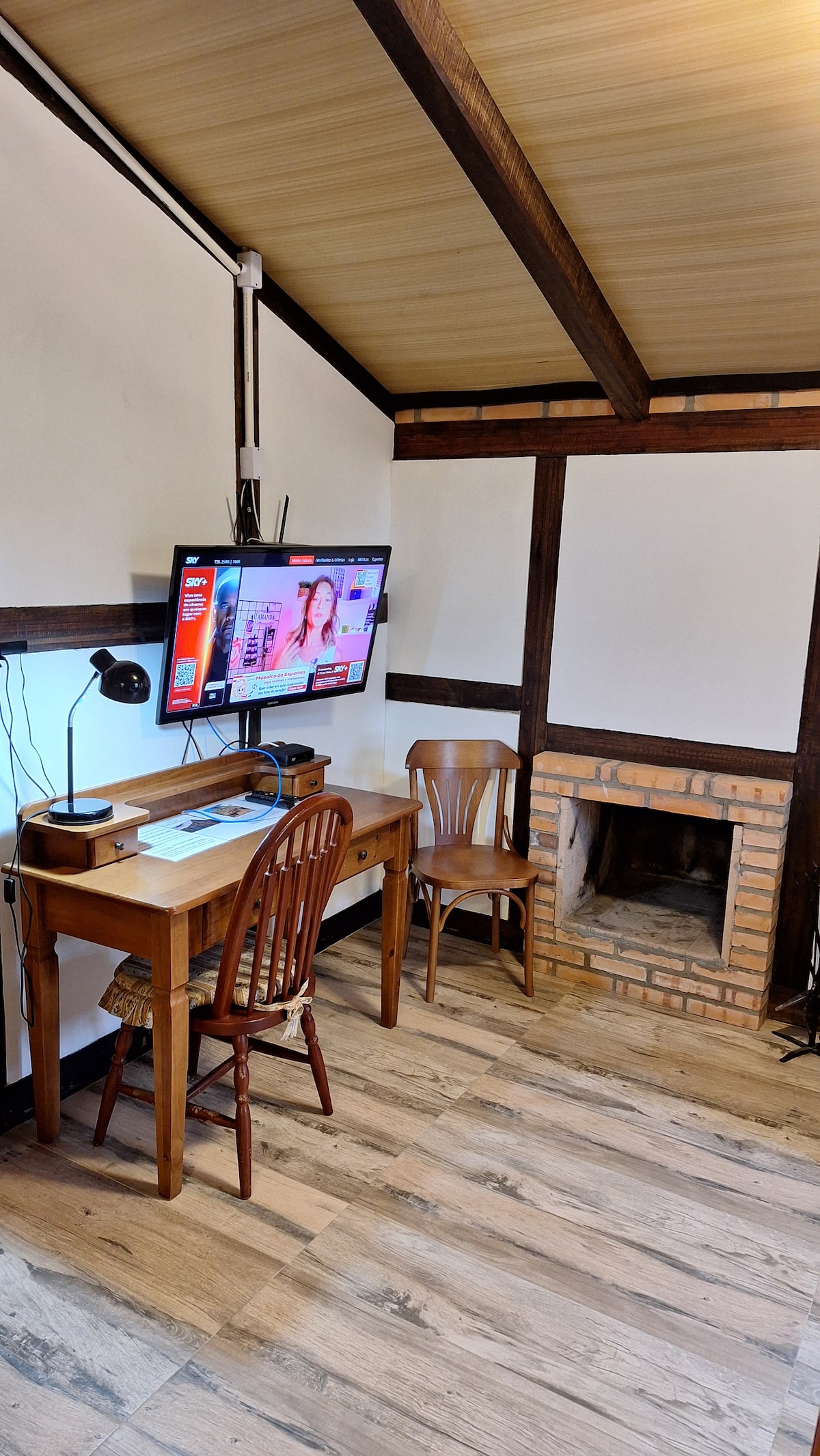 Chalet for up to 8 people with full kitchen and barbecue, with large balcony, floor fire on the balcony, overlooking a lake, cable TV, fireplace, 10 km from the city center and 3 km from the supermarket, a place to walk in nature and a cycling route passing in front. We have Wi-Fi in the chalet. Home office. You can enjoy the site with a gazebo and paddle boat. Dollhouse for children. View on Sítio Vale do Lago's social media