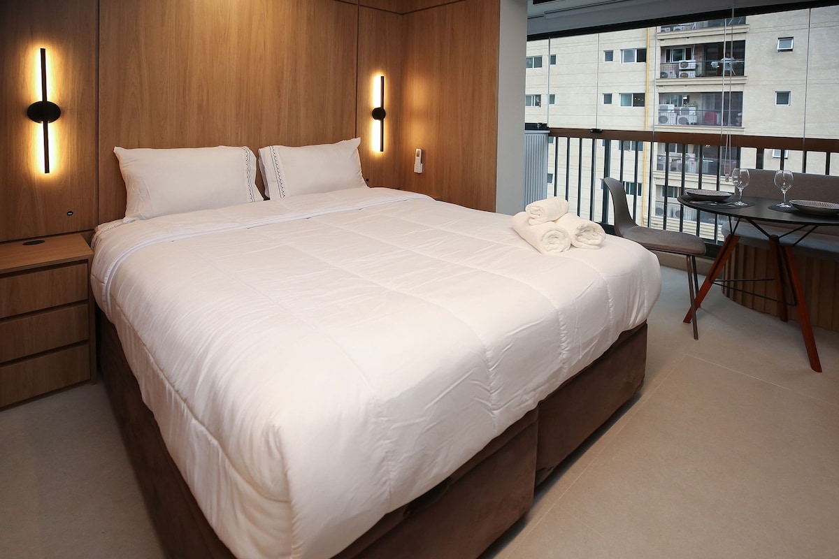 Enjoy São Paulo in an incredible location with full leisure facilities, free parking, a fantastic swimming pool and gym on the Rooftop, Coworking space and a self service grocery store. Fit industrial style built to give comfort 20m from Oscar Freire and 1 minute from Metro Oscar Freire. Come enjoy in the best building in the region. The apartment has a full kitchen, WiFi, coffee maker, toaster, Nespresso, iron, hair dryer, pots and pans set. Also enjoy our Buddenmeyer bedding and our big shower