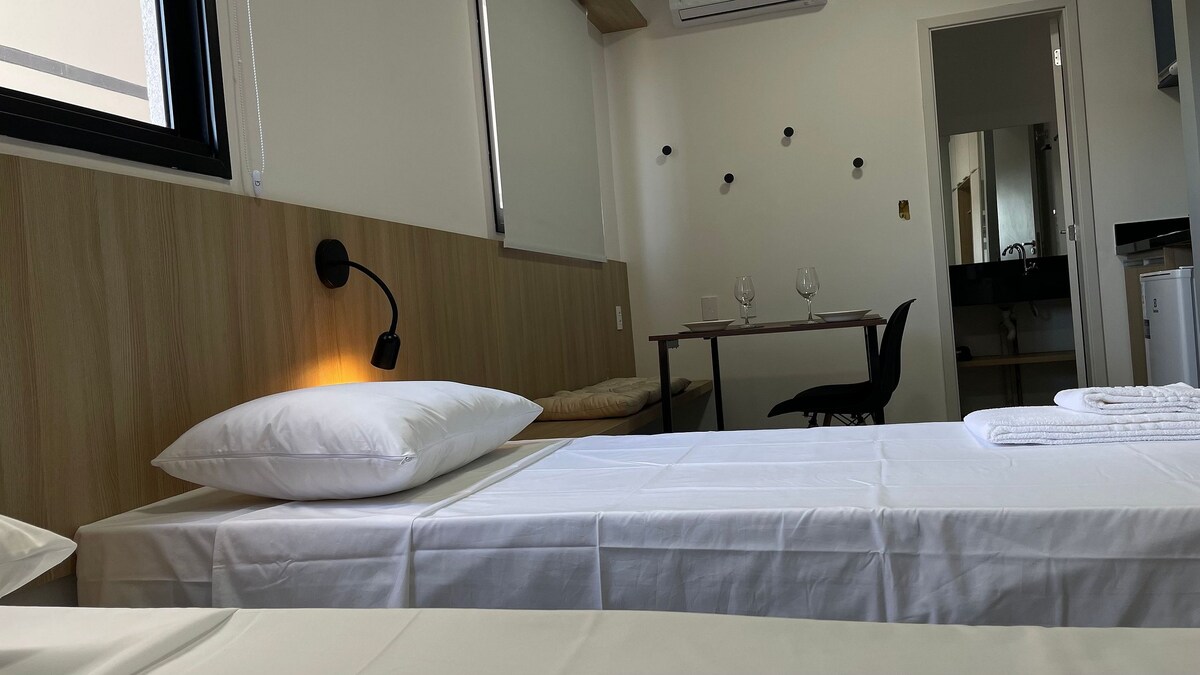 O ambiente oferece duas camas de solteiro que podem se unir e acomodar um casal, roupas de cama e toalhas brancas e macias, bancada multifuncional para estudos e refeições e um chuveiro com ótima pressão para um banho relaxante. O apartamento possui Wifi de qualidade, cozinha completa, mesa para refeições, trabalho e estudo, secador de cabelo e amenities.